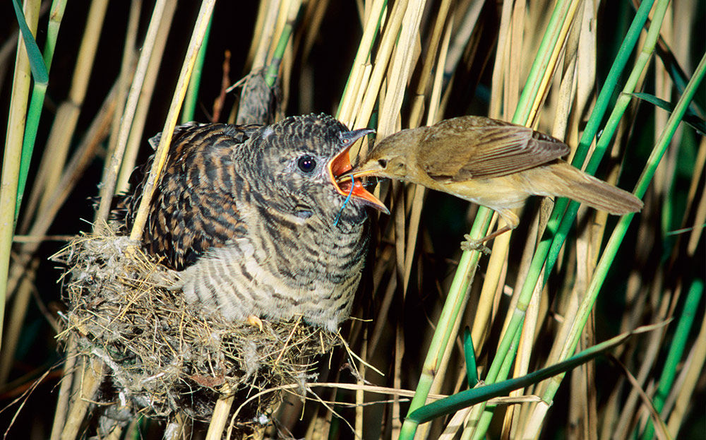カッコウの雛に餌を与えるヨシキリの親鳥