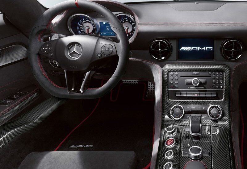 ところが、SLSのブラックシリーズではユーモアが失われ、超合理的な車に変化している。妙な話だ。どういうわけかフェラーリのような電子制御式ディファレンシャルによって後輪が制御される。トランスミッションはフェラーリ F12ベルリネッタとまったく同一のものが採用されている。